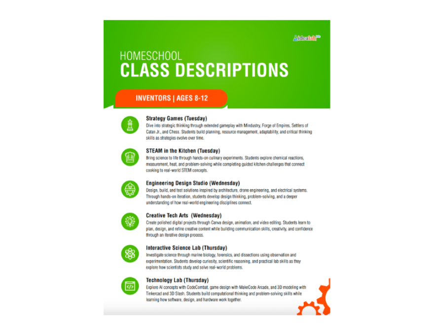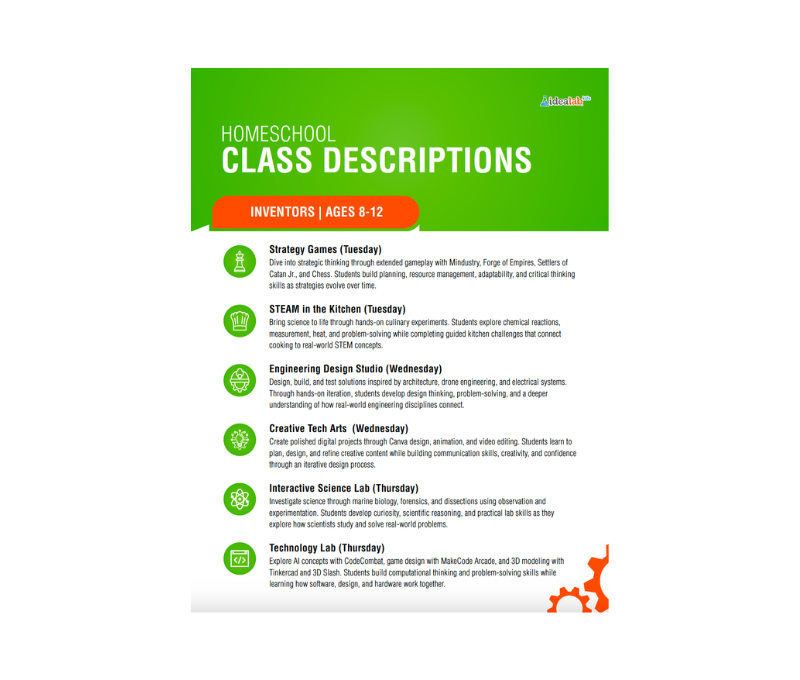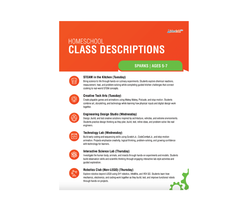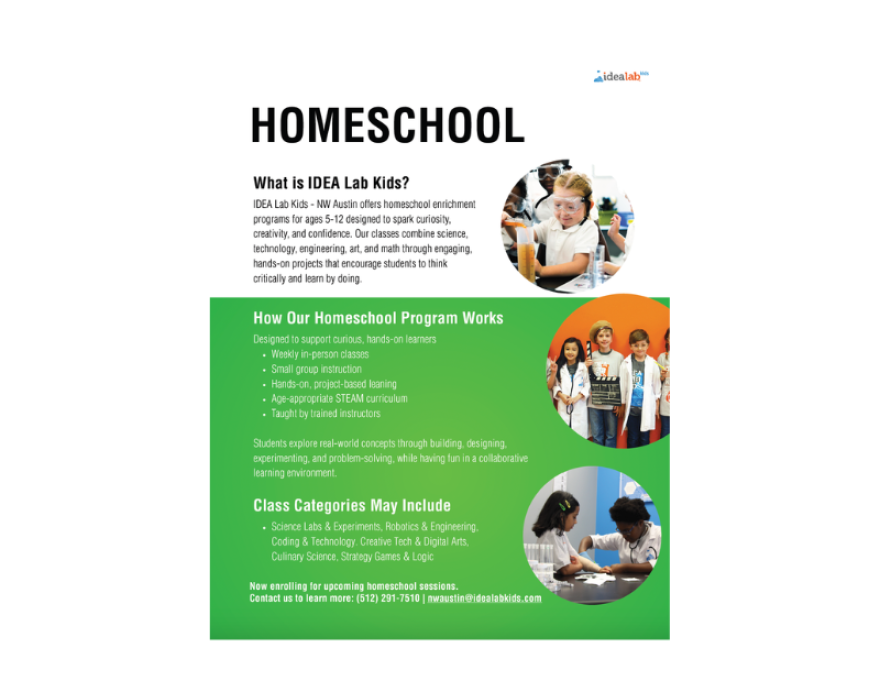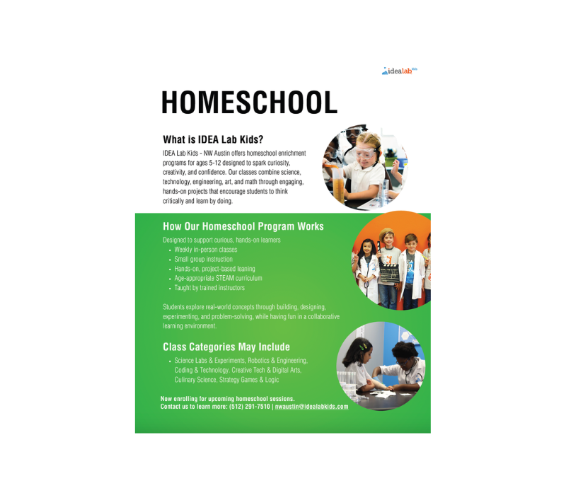 Idea Lab Homeschool Program What it is: A hands-on STEAM enrichment program for homeschooled kids ages 5–12, held at 13642 Research Blvd, Austin, TX 78750. Classes run Tuesday through Thursday, 10am–1pm, from January through mid-May 2026.