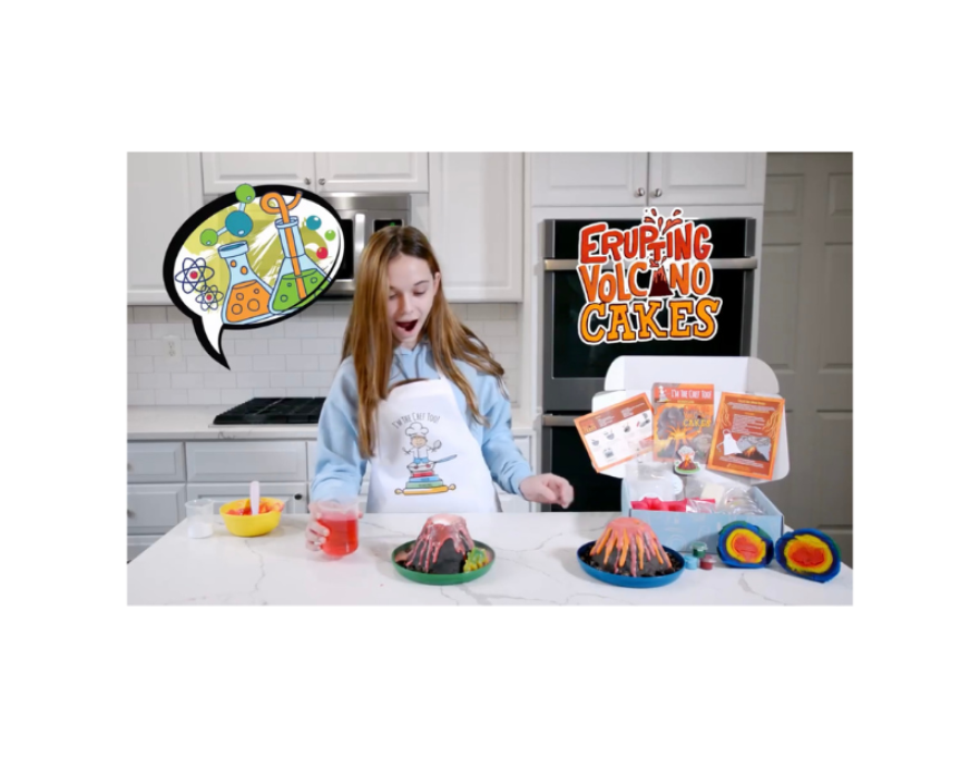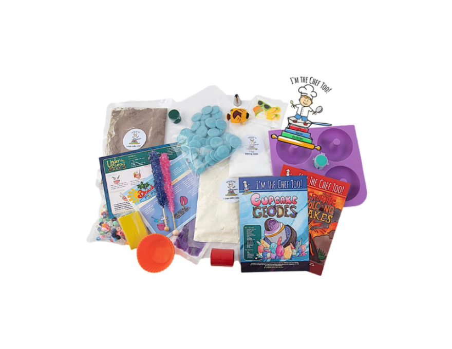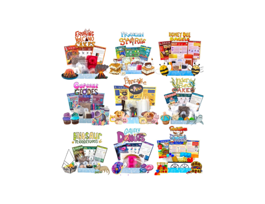 Will you be an astronomer and explore our solar system by baking galactic donuts or step into the role of a mad scientist as you engineer and erupt volcano cakes while learning about chemical reactions? Or better yet, put on your hard hat and become a geologist to investigate the properties of rocks and gems through baking cupcake geodes! Each recipe is infused with educational concepts and a surprise adventure with a STEAM activity, specialty supplies, and pre measured dry ingredients.