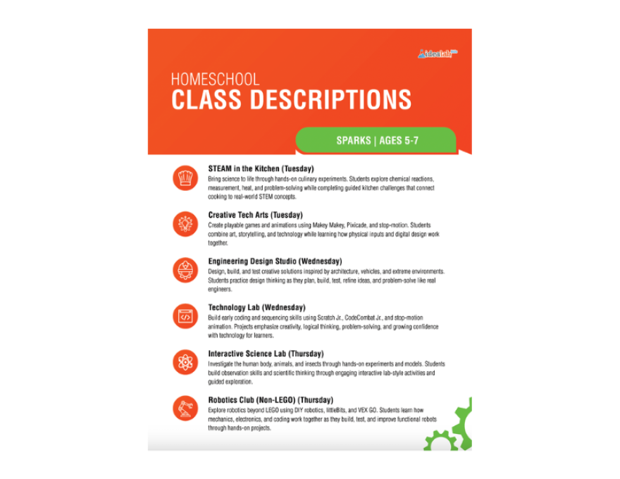 Idea Lab Homeschool Program What it is: A hands-on STEAM enrichment program for homeschooled kids ages 5–12, held at 13642 Research Blvd, Austin, TX 78750. Classes run Tuesday through Thursday, 10am–1pm, from January through mid-May 2026.